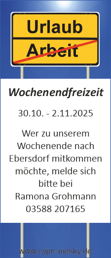 Rüstzeitenheim Sonnenschein wohnen. Wir haben uns einiges vorgenommen: Ein Ausflug wird uns an eine Staumauer und ein weiterer zu den Israelfreunden nach Reichenbach führen. Wanderungen und Spaziergänge im wunderschönen Park sowie bei schlechtem Wetter ein Besuch des Hallenbades gehören dazu. Am Abend wollen wir uns zum Singen und Spielen zusammenfinden und biblische Themen besprechen. Genug Zeit zur Pflege der Freundschaften oder zum Kennenlernen wird eingeplant. Am Sonntag gehen wir in den Gottesdienst der Brüdergemeine und reisen nach dem Mittagessen wieder nach Hause. Mitglieder der CVJM aus Niesky und Holzgerlingen treffen sich so schon seit vielen Jahren, sozusagen auf halber Strecke. Gern laden wir Freunde und Interessierte ein, mitzukommen. Auch eine Fahrgemeinschaft ist denkbar.